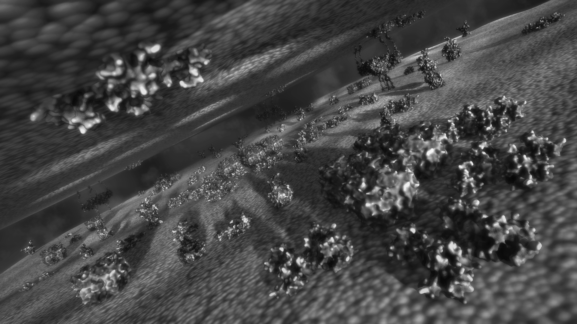 The SciVis group was set up by Monica Zoppè, a biology researcher in the Institute of Clinical Physiology of the National Research Council of Italy, with the idea of making visible life at nanoscopic level. We elaborated a visual code designed to convey information stored, or calculated in molecular structures, and a method for elaborating protein motion, based on a game engine. The starting material is atomic coordinates (up to several thousands) that compose the object; this is elaborated using a number of programs developed within the scientific (VMD, pyMOL) and the graphics fields (Blender). The primary information delivered is the shape and movement of the molecules, which are inserted in an artist­ created environment, based on sound biological information. The forces that determine protein behavior, electrostatic and lipophilic potentials, can also be represented, as special effects (electrostatic field lines), and as a pattern of texture on the molecular surfaces.